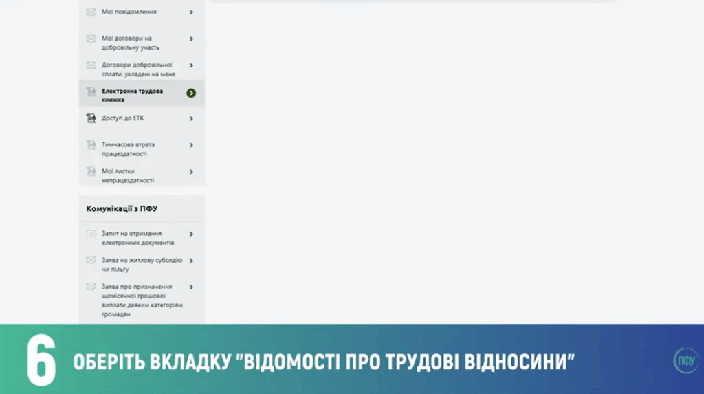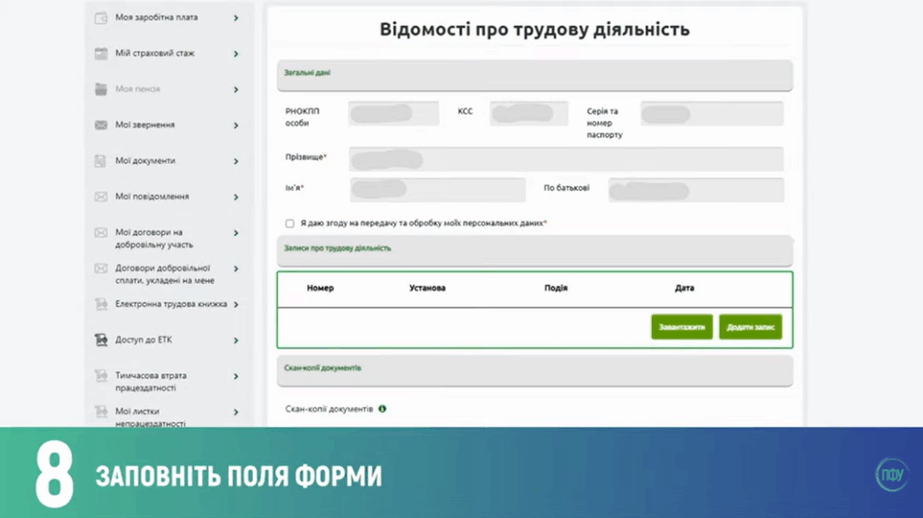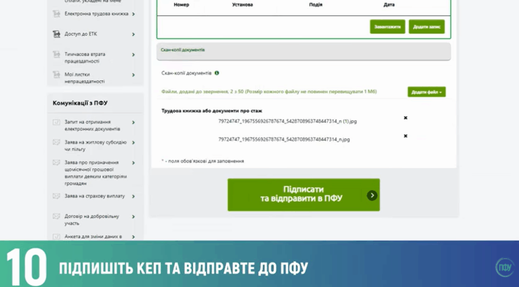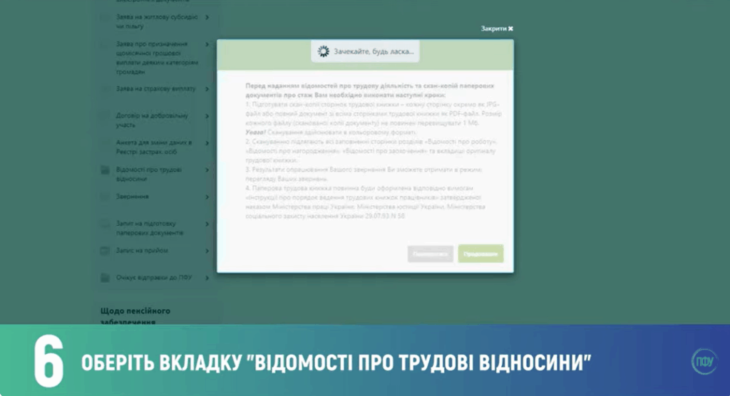 У розділі «Комунікації з ПФУ» ->: ЗЛІВА В МЕНЮ: «Відомості про трудові відносини», заповніть дані, надайте згоду на обробку персональних даних, завантажте кольорові скан-копії трудової книжки та інших документів (JPG або PDF, до 1 МБ кожен), а потім підпишіть та відправте звернення КЕП.