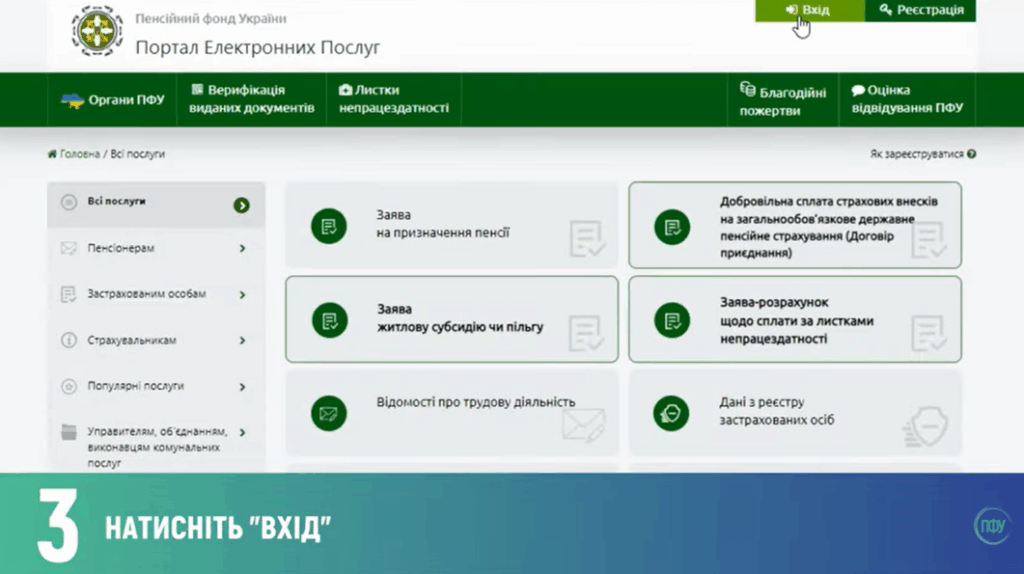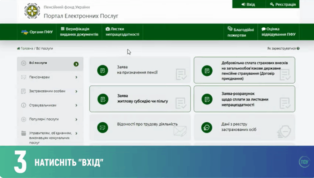 - Зайдіть на портал електронних послуг Пенсійного фонду України за посиланням https://portal.pfu.gov.ua.