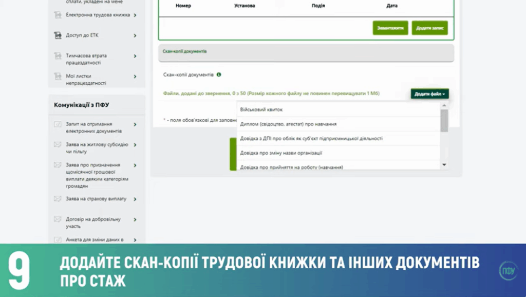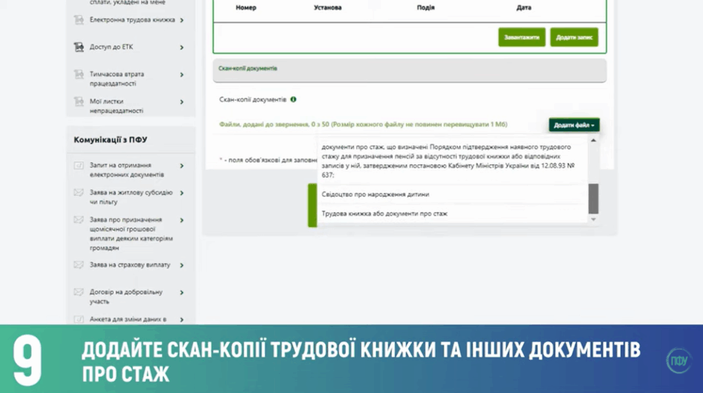 - Додавання інших документів (за потреби): Також додайте скановані копії документів, що підтверджують стаж, наприклад, свідоцтво про народження дитини або диплом про освіту.