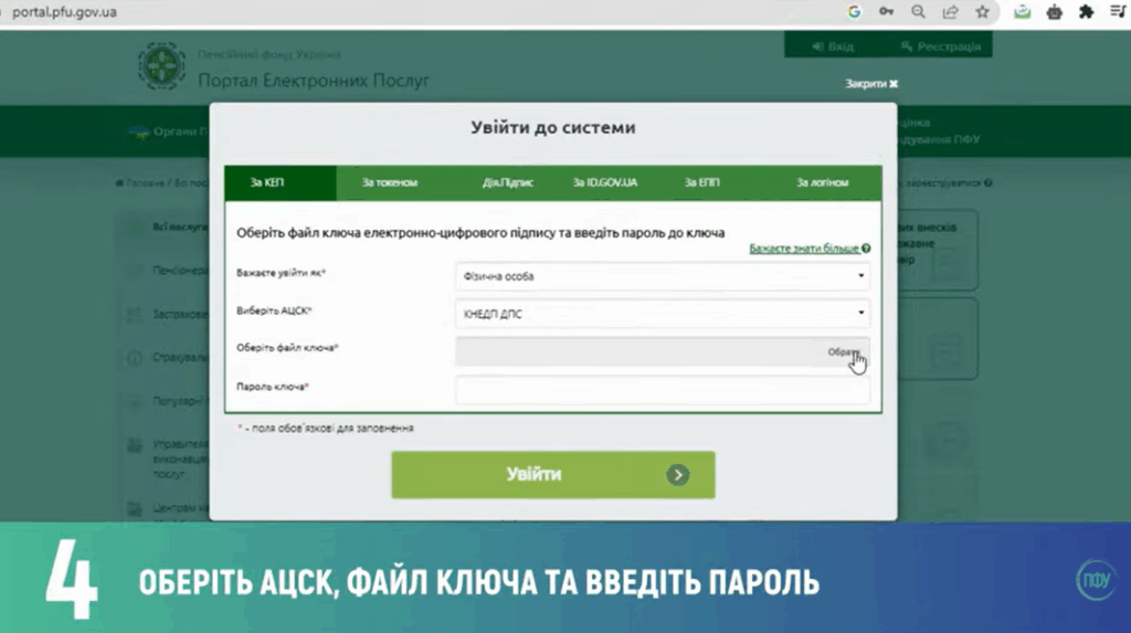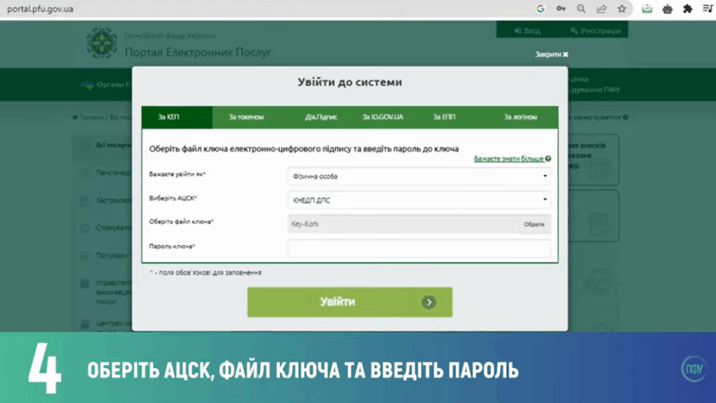 - Авторизація: Увійдіть на вебпортал Пенсійного фонду України (portal.pfu.gov.ua) за допомогою кваліфікованого електронного підпису (КЕП) або Bank ID.