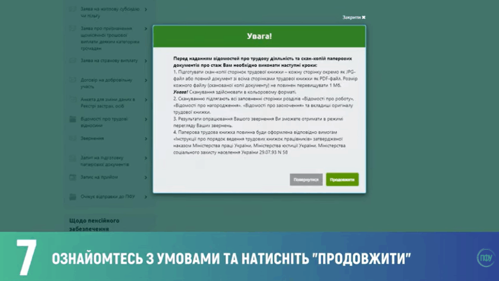 Завантаження документів: Завантажте кольорові скан-копії всіх заповнених сторінок трудової книжки в хронологічному порядку (у форматі JPG або PDF, розмір кожного файлу до 1 МБ).