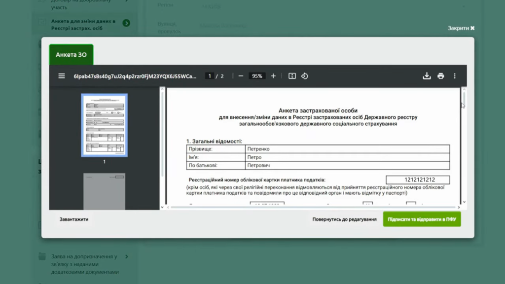 - Підпишіть та надішліть: Підпишіть анкету КЕП та відправте її до ПФУ. Результат перегляньте у розділі «Мої звернення».