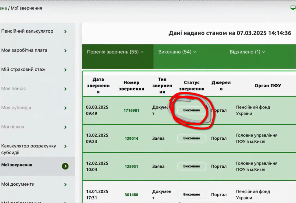 Ваша заява відправляється на опрацювання працівников Пенсійного фонду. Переглянути стан заяви ви можете в розділі МОЇ ЗВЕРНЕННЯ: