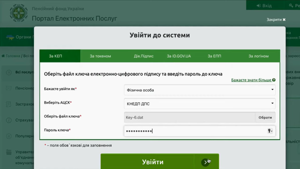 - Авторизуйтесь: Зайдіть на портал портал електронних послуг Пенсійного фонду України (portal.pfu.gov.ua) за допомогою кваліфікованого електронного підпису (КЕП).