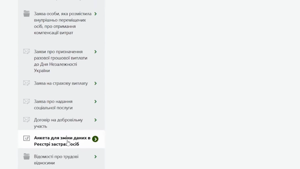 - Знайдіть анкету: У лівому меню оберіть розділ «Комунікації з ПФУ» та пункт «Анкета для зміни даних в Реєстрі застрахованих осіб».